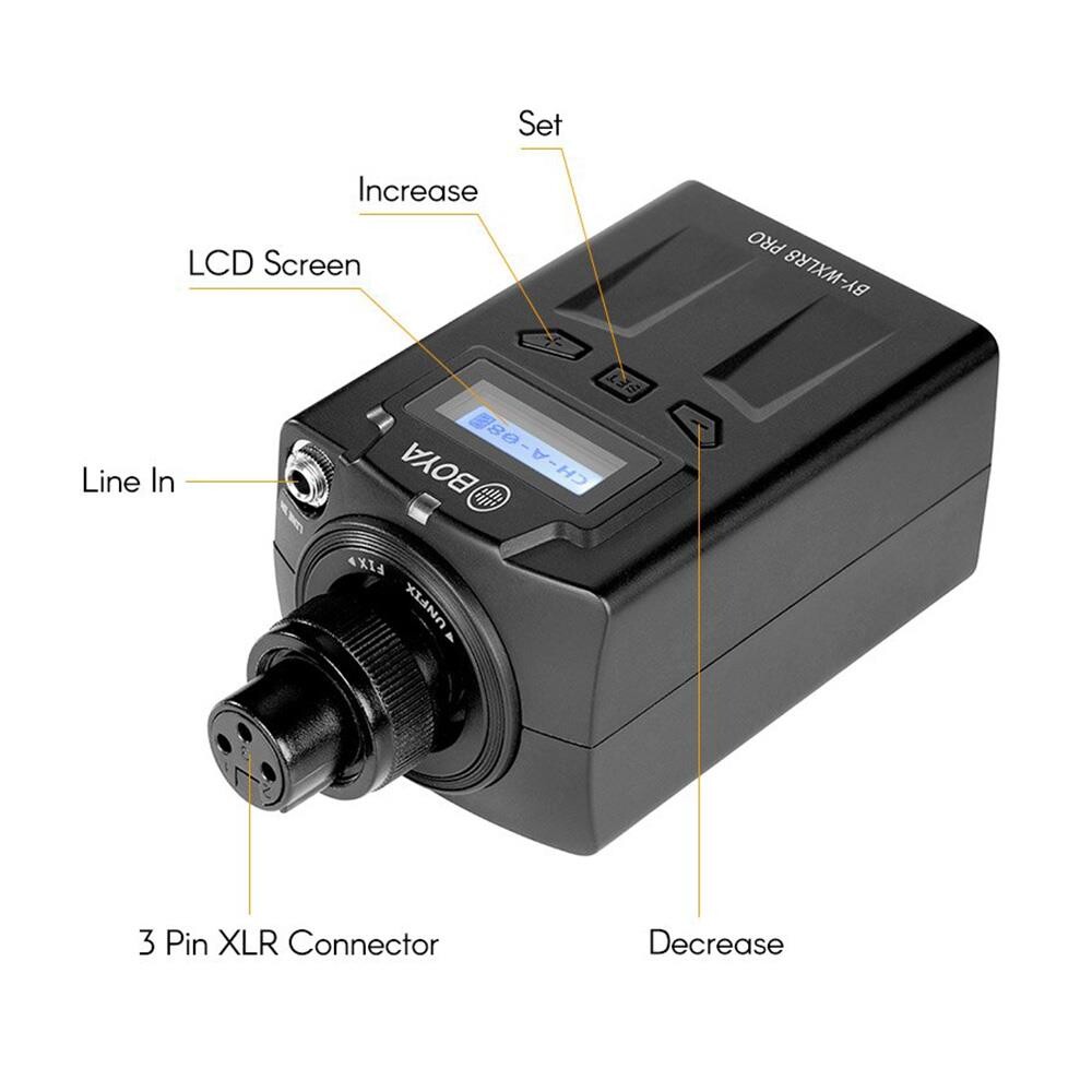 Ürün 3-pin XLR girişli dinamik el mikrofonları için yapılmış kablosuz vericidir, Boya BY-WM8 Pro ve RX8 kablosuz alıcıları ile uyumlu olarak çalışmaktadır. Ayrıca cihazın üzerindeki 3.5mm jak girişi sayesinde farklı mikrofon veya ses kaynaklarıda bağlanılarak kablosuz ses aktarımı yapılabilmektedir.-Lcd ekran