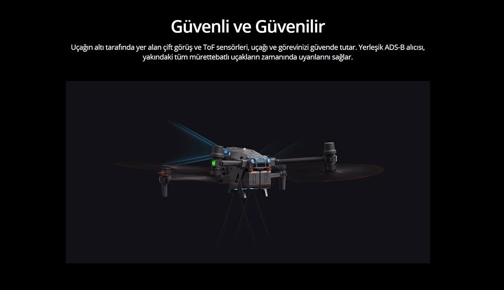 Yukarı/Aşağı/Geri/Yana: 0,5-33 mBakış Açısı 65° (Y), 50° (D) Çalışma Ortamı Net desenli ve yeterli aydınlatmaya sahip yüzeyler (> 15 lux) Kızılötesi Algılama Sistemleri Engel Algılama Menzili 0.1 ila 10 m Bakış Açısı 30° Çalışma Ortamı Büyük, dağınık ve yansıtıcı engeller (yansıma > %10) TB30 Akıllı Uçuş Bataryası Kapasite 5880 mAh Gerilim 26,1 V Pil Türü Li-ion 6S Enerji 131.6 Wh Net Ağırlık Yaklaşık 685 gr Çalışma Sıcaklığı -20° - 50° C (-4° - 122° F) Depolama Sıcaklığı 20° - 30° C (68° - 86° F) Şarj Sıcaklığı -20° - 40° C (-4° - 104° F) Kimyasal Sistem LiNiMnCoO2 Yardımcı Işıklar Etkili Aydınlatma Mesafesi 5 m Aydınlatma Tipi 60 Hz, sabit parlama Uzaktan Kumanda Ekran 1920×1200 piksel, 1200 cd/m² parlaklığa sahip 7,02 inç LCD dokunmatik ekran Dahili Batarya Li-ion (6500 mAh @ 7,2 V) Şarj Tipi Pil istasyonu veya USB-C (maksimum 65W, 20V) Şarj Süresi 2 saat Kimyasal Sistem LiNiCoAIO2 Harici Batarya (WB37 Akıllı Batarya) Kapasite 4920 mAh Voltaj 7,6 V Pil Tipi Li-ion Enerji 37,39 Wh Kimyasal Sistem LiCoO2 Çalışma Süresi Dahili Pil Yaklaşık 3 saat 18 dk Dahili + Harici Batarya Yaklaşık 6 saat Koruma Derecesi IP54 GNSS GPS+Galileo+BeiDou Çalışma Sıcaklığı -20° - 50° C (-4° - 122° F) O3 Enterprise Çalışma Frekansı 2.4000-2.4835 GHz, 5.725-5.850 GHz Maksimum İletim Mesafesi 15 km (FCC); 8 km (CE/SRRC/MIC) Verici Gücü (EIRP) 2,4 GHz: <33 dBm (FCC); <20 dBm (CE/SRRC/MIC) Kablosuz İnternet Protokol Wi-Fi 6 Çalışma Frekansı 2.4000-2.4835 GHz; 5.150-5.250 GHz; 5.725-5.850 GHz Bluetooth Protokol Bluetooth 5.1 Çalışma Frekansı 2.4000-2.4835 GHz BS30 Şarj İstasyonu Boyutlar 353×267×148 mm Net Ağırlık 3,95 kg Uyumlu Pil Türü TB30 Akıllı Uçuş Bataryası, WB37 Akıllı Batarya Giriş 100-240 VAC, 50/60 Hz Çıkış TB30: 26,1 V, 8,9 A; WB37: 8,7 V, 6 A Çıkış Gücü 525W USB-C bağlantı noktası Maks. 65 W çıkış gücü USB-A bağlantı noktası Maks. 10 W (5 V, 2 A) çıkış gücü Güç Tüketimi (boşta) < 8W Çıkış Gücü (pil ısıtırken) Yaklaşık 30W Çalışma sıcaklığı -20° - 40° C (-4° - 104° F) Koruma Derecesi IP55 (kapak kapalıyken) Şarj Süresi Yaklaşık 30 dk (%20-%90), 50 dk (%0-%100) Koruma Özellikleri Geri Akış Koruması, Kısa Devre Koruması, Aşırı Gerilim Koruması, Aşırı Akım Koruması, Sıcaklık Koruması