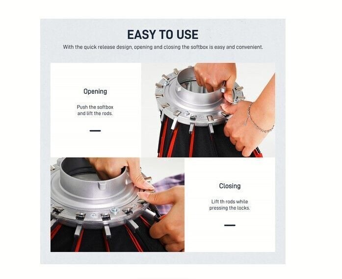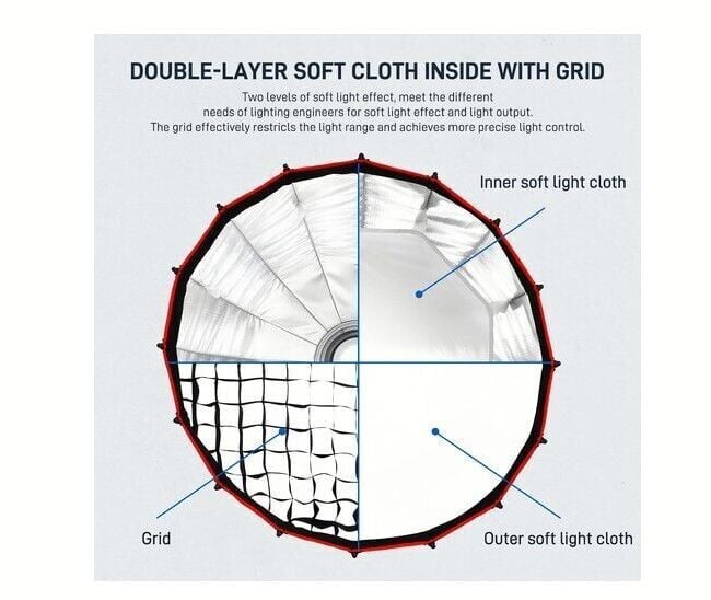 GVM 60 cm Parabolik Softbox, Bowens montajlı LED panellerinizi derin parabolik yüzeyiyle hem geniş hem de odaklanmış yumuşak bir ışık kaynağına dönüştürür. Pop-up alüminyum çerçeve sistemiyle saniyeler içinde kurulur ve sökülür. Çift katmanlı difüz kumaş, homojen ışık dağılımı sağlarken; beraberindeki 60° honeycomb grid, ışık demetini daraltıp kontrastlı ve net gölgeler oluşturmanıza olanak tanır.