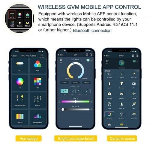 Bi-Color + RGB Modu: 2700 K–7500 K beyaz aralığı; 0–360° Hue ve %0–100 doygunluk
