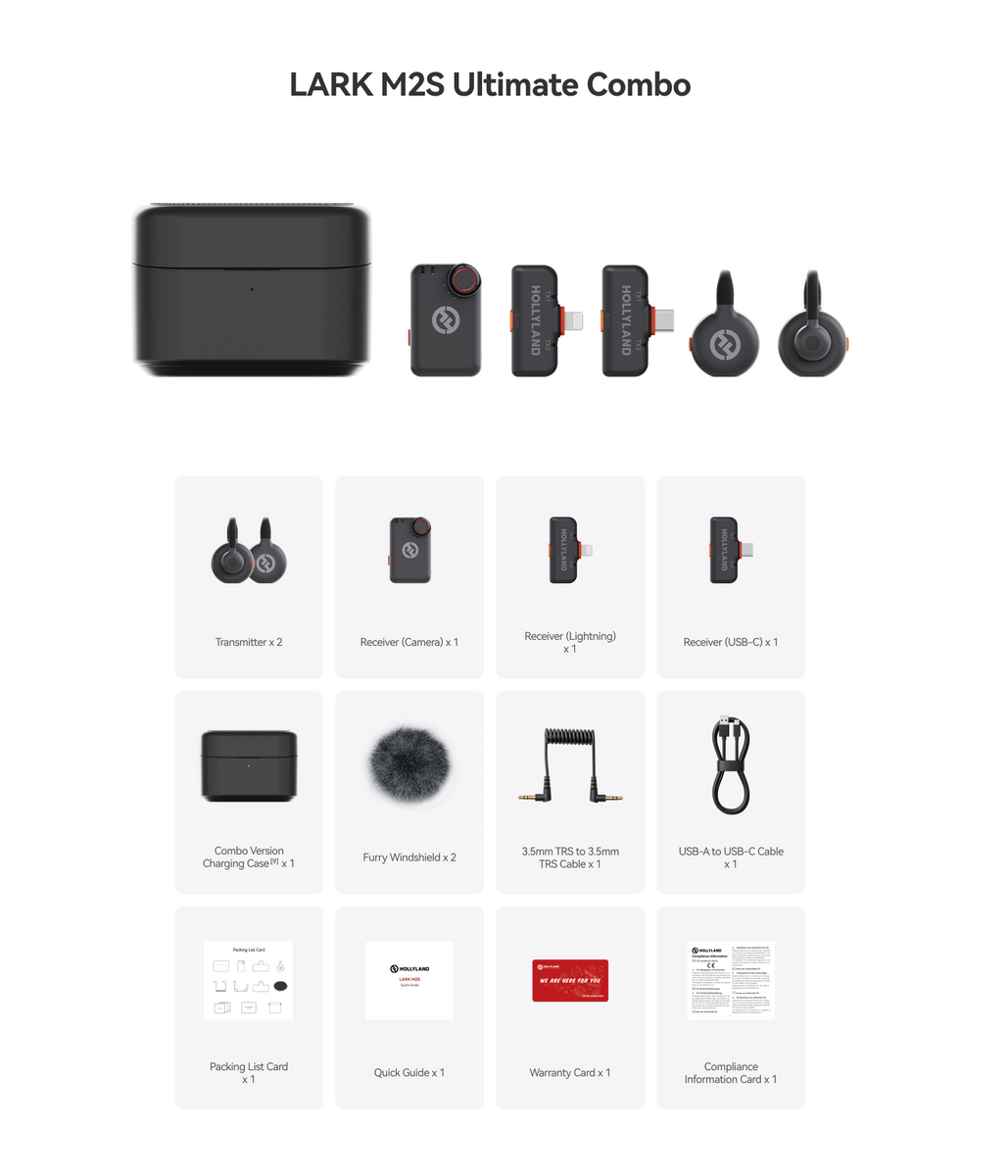 Hollyland Lark M2S Ultimate Combo, iki verici (transmitter) ve iki alıcıyla (receiver) profesyonel kablosuz ses aktarımı sağlayan kapsamlı bir mikrofon sistemidir. USB-C ve 3.5 mm TRS bağlantı seçenekleri ile Android, iOS, DSLR ve aynasız kameralarla uyumlu olarak çalışır. Ayrı mikrofon klipsleri, taşıma çantası, şarj çantası ve çeşitli aksesuarlarıyla son derece kullanışlı bir set sunar.