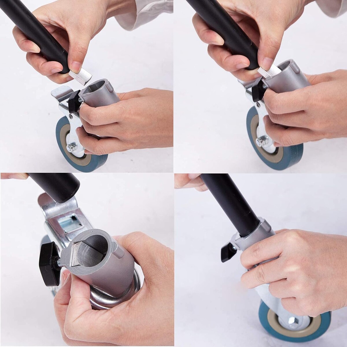 Kaiseberg’in profesyonel döner tekerlek seti, 22 mm bacak çapına sahip hafif ışık ayaklarını stüdyoda çok daha hızlı, pratik ve güvenli şekilde hareket ettirmeniz için tasarlanmış yüksek dayanımlı bir çözümdür. Alüminyum alaşım, demir ve sağlam plastik gövde yapısıyla uzun süreli kullanımlarda bile formunu korur ve ağır hizmet koşullarında üstün performans sunar.