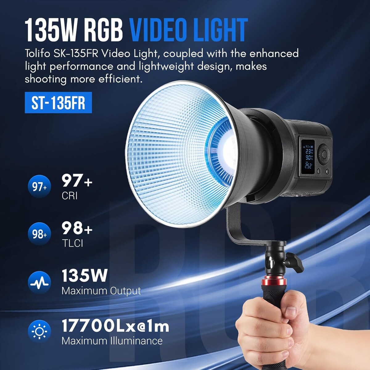Model SK-135FR Çıkış Gücü 135W CRI 97+ TLCI 97+ CCT 2700K-6500K Parlaklık 0-100% Işık Kaynağı Yüksek güçlü COB LED çip Renk 0-360° Doygunluk 0-100% Aşırı Isınma Koruması Evet. 90°C'de çalışmayı durdurur; 60°C'de devam eder. Aydınlatma Efekti 20FX Efekt Hızı 1-9 Seviye APP Linklite 2.4G Uzaktan Kumanda Evet, 99 kanal Uyumlu Pil Modeli NP-F550/750/970 (Pil ile kullanımda maksimum güç 60W ile sınırlıdır.) Çalışma Voltajı 120W adaptör girişi: 100-240V ~ 50/60Hz, çıkış DC19V6.3A, DC5.5*2.1 fiş Ürün Boyutu 142 x 121 x 121mm