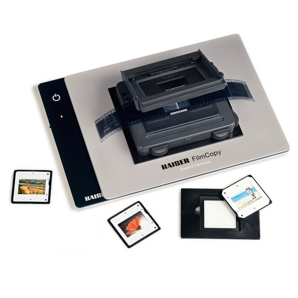 The FilmCopy Vario Kit (2458) already includes the super flat “slimlite plano” LED light box (2453) for viewing and sorting slides and negatives and for illumination during digitization (illuminated area 22 x 16 cm (8.7 x 6.3 in.), 5000 Kelvin daylight, CRI = 95, continuously dimmable, battery and mains operation).