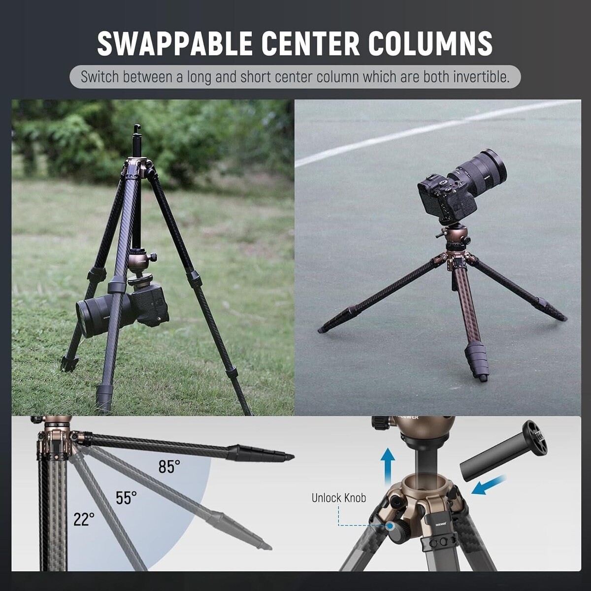 Çıkarılabilir Merkez Sütun: Düşük açılı çekimler için ters çevrilebilir kullanıma izin verir