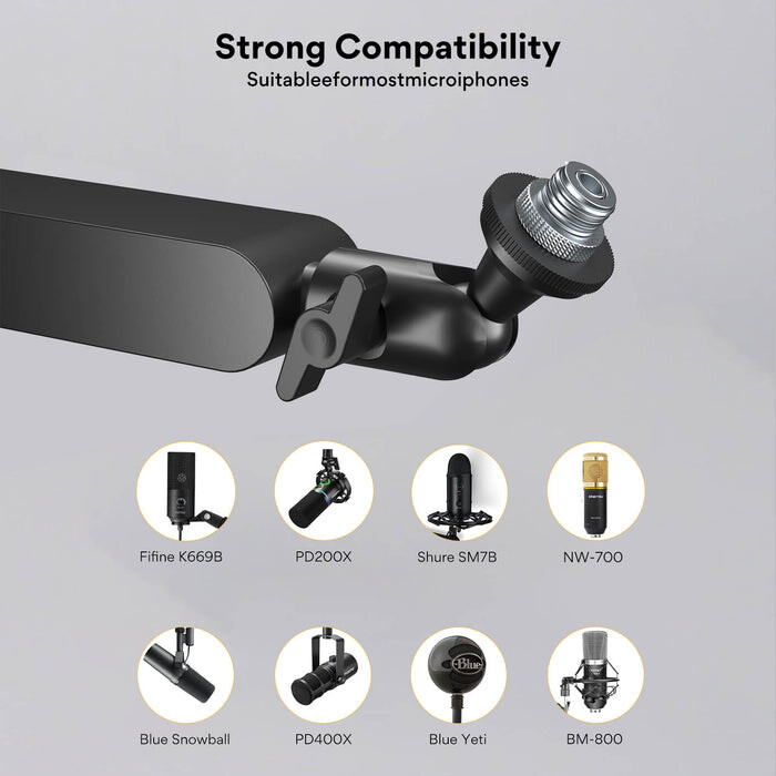 BA92, 2 kg'a kadar mikrofon ağırlığını güvenle taşıyabilir. 3/8" ile 5/8" arası vida adaptörü sayesinde, piyasadaki çoğu mikrofonla uyumlu şekilde çalışır. Özellikle Maono mikrofonları ile tam uyumludur: