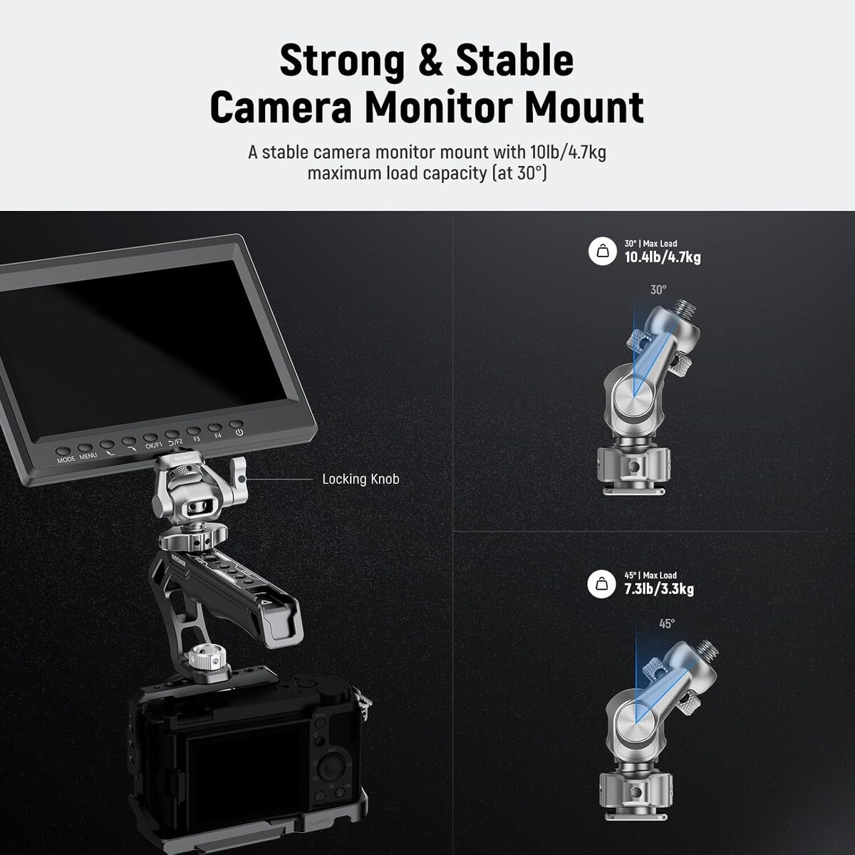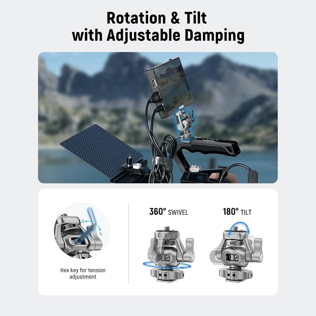 NEEWER MA017 Monitör Montajı, kamera kafeslerine, üst tutamaklara veya fotoğraf makinelerinin hot shoe yuvasına hızlı ve güvenli bir şekilde bağlanmak için tasarlanmıştır. Ayarlanabilir sönümleme özelliği sayesinde monitörünüzü hassas bir şekilde konumlandırabilir ve dış mekan çekimleri, yerinde film yapımı veya vlog çekimleri için stabil bir çözüm elde edebilirsiniz.