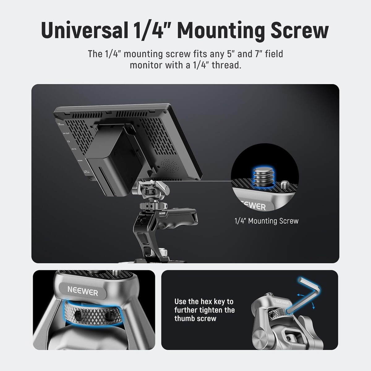- Eğilme Önleyici Pin ve 1/4' Vida: Geri çekilebilir eğilme önleyici pin ve kaymaz kauçuk ped, monitörün kaymasını veya dönmesini etkili bir şekilde engeller. Üstteki 1/4' vida, NEEWER 5'-7' monitörler ve diğer uyumlu markalar (SmallHD, Atomos, Blackmagic Design, Feelworld) ile çalışır.