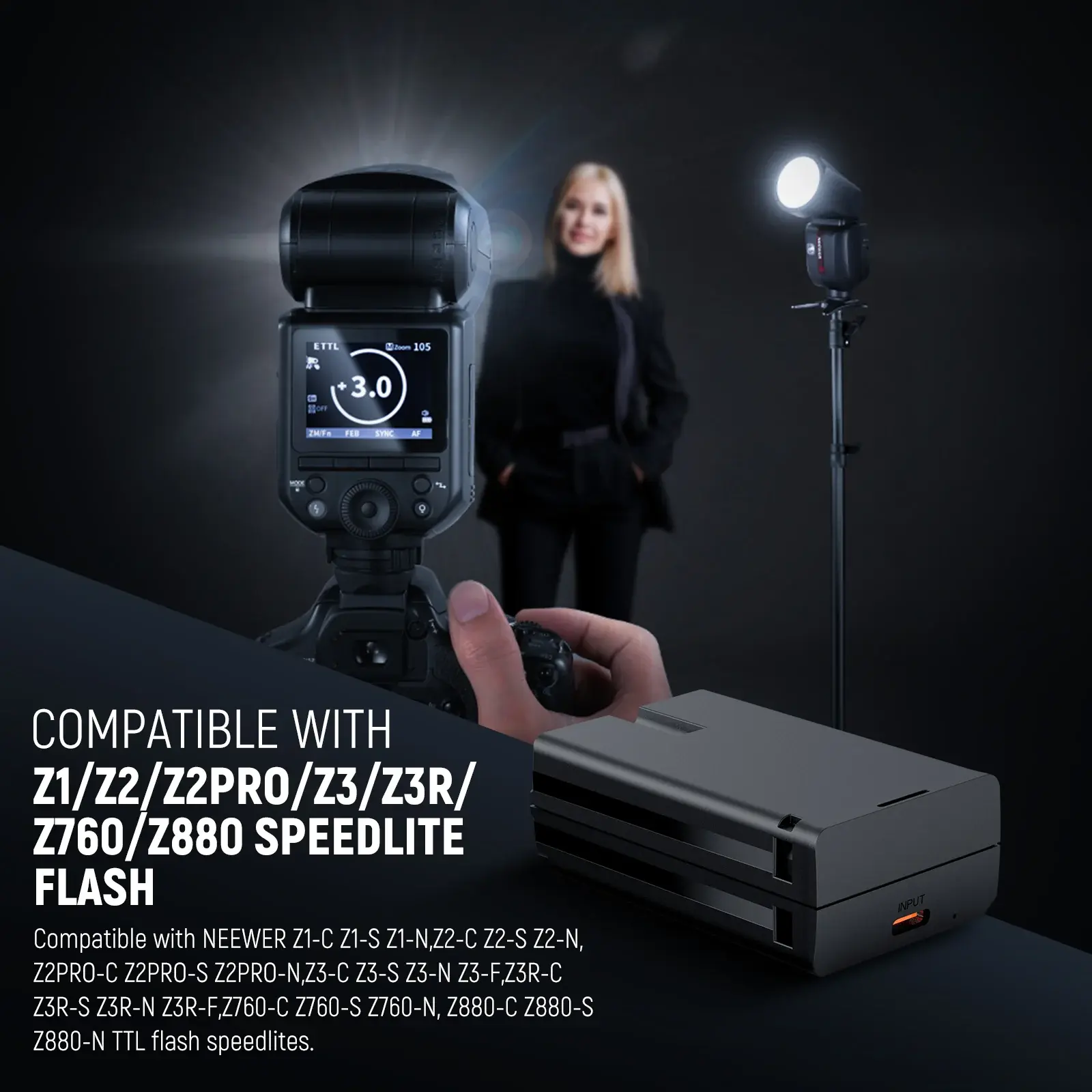 - Genişletilmiş Kapasite: 3000mAh (21.6Wh) kapasitesi ile tek şarjla 480'den fazla tam güçte flaş çakımı sağlar.