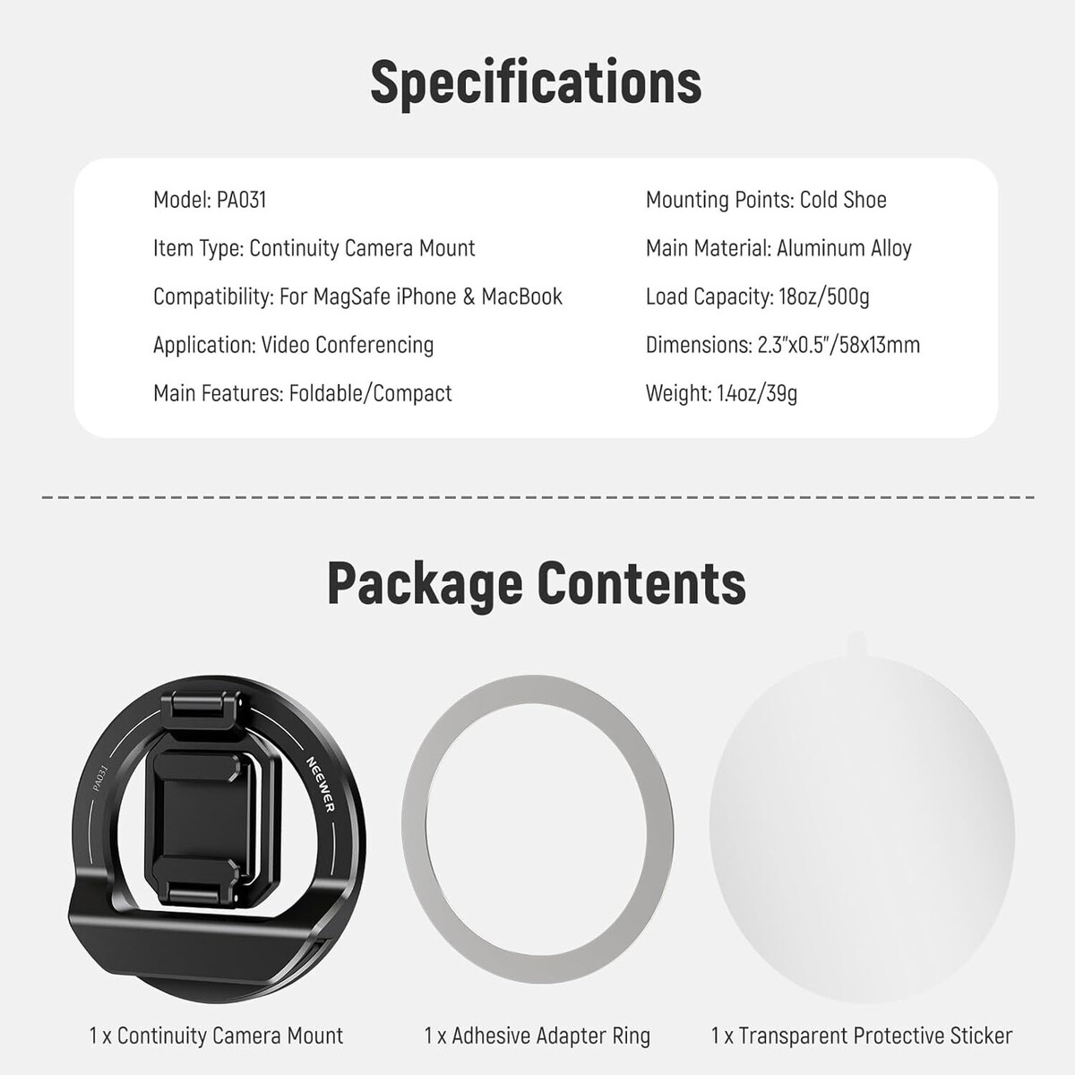 NEEWER PA031, iPhone'unuzu MacBook'unuzun ekranına ( Continuity Camera özelliği için) hızlı ve güvenli bir şekilde takmanızı sağlayan, katlanabilir ve kompakt bir montajdır. Video konferans, çevrimiçi dersler ve canlı yayınlar için yüksek kaliteli bir kamera deneyimi sunar.