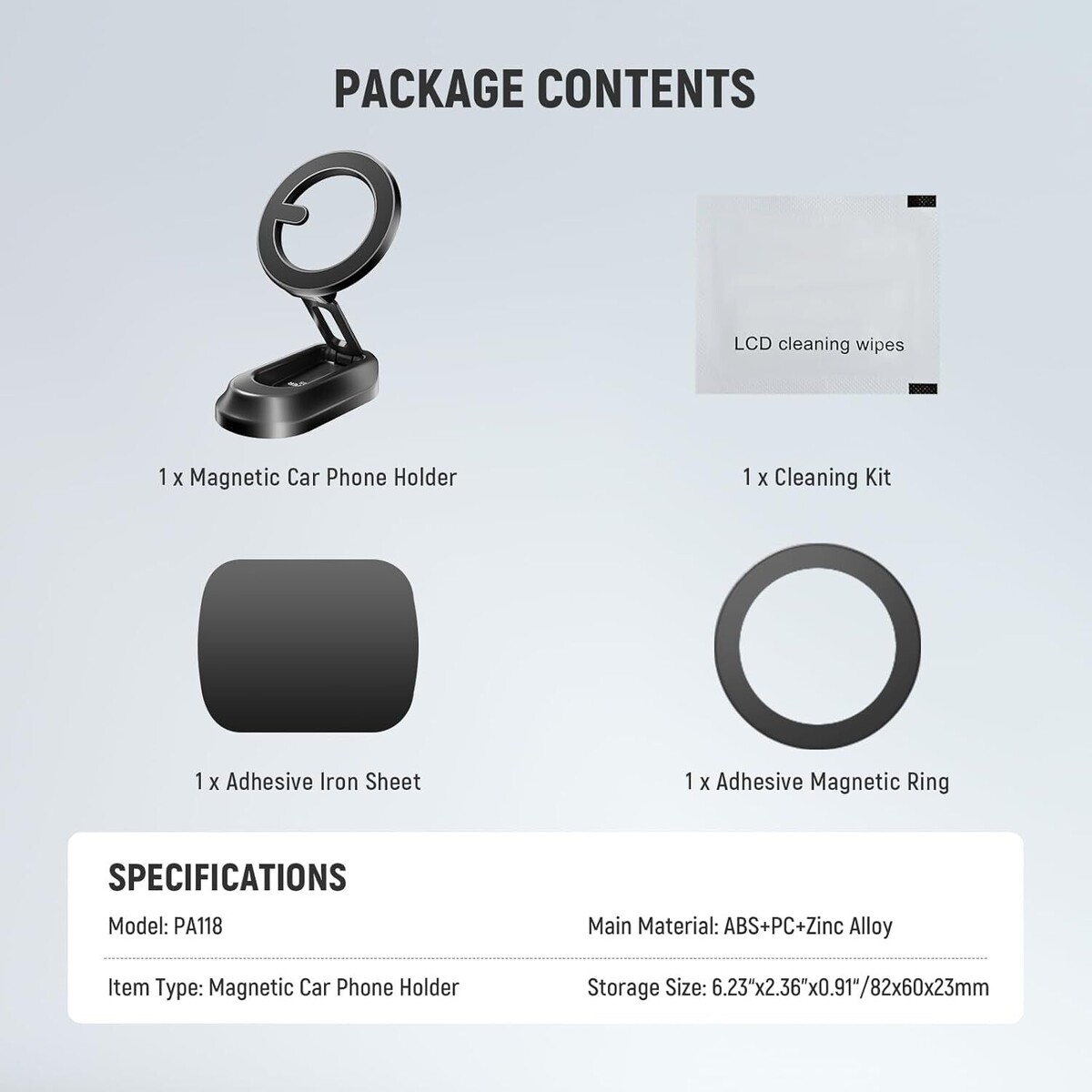 Model PA118 Ürün Tipi Manyetik Araç Telefon Tutucu **Ana Malzeme** ABS+PC+Çinko Alaşım **Boyutlar (Açık)** 82x60x106 mm (6.23'x2.36'x4.17') **Depolama Boyutları (Kapalı)** 82x60x23 mm (6.23'x2.36'x0.91') **Manyetik Güç** N52 Neodimyum Mıknatıslar **Ayarlanabilirlik** 180° Eğilebilir Başlık **Uyumluluk** MagSafe Uyumlu Telefonlar ve Dahil Olan Aksesuarlar ile Diğer Telefonlar