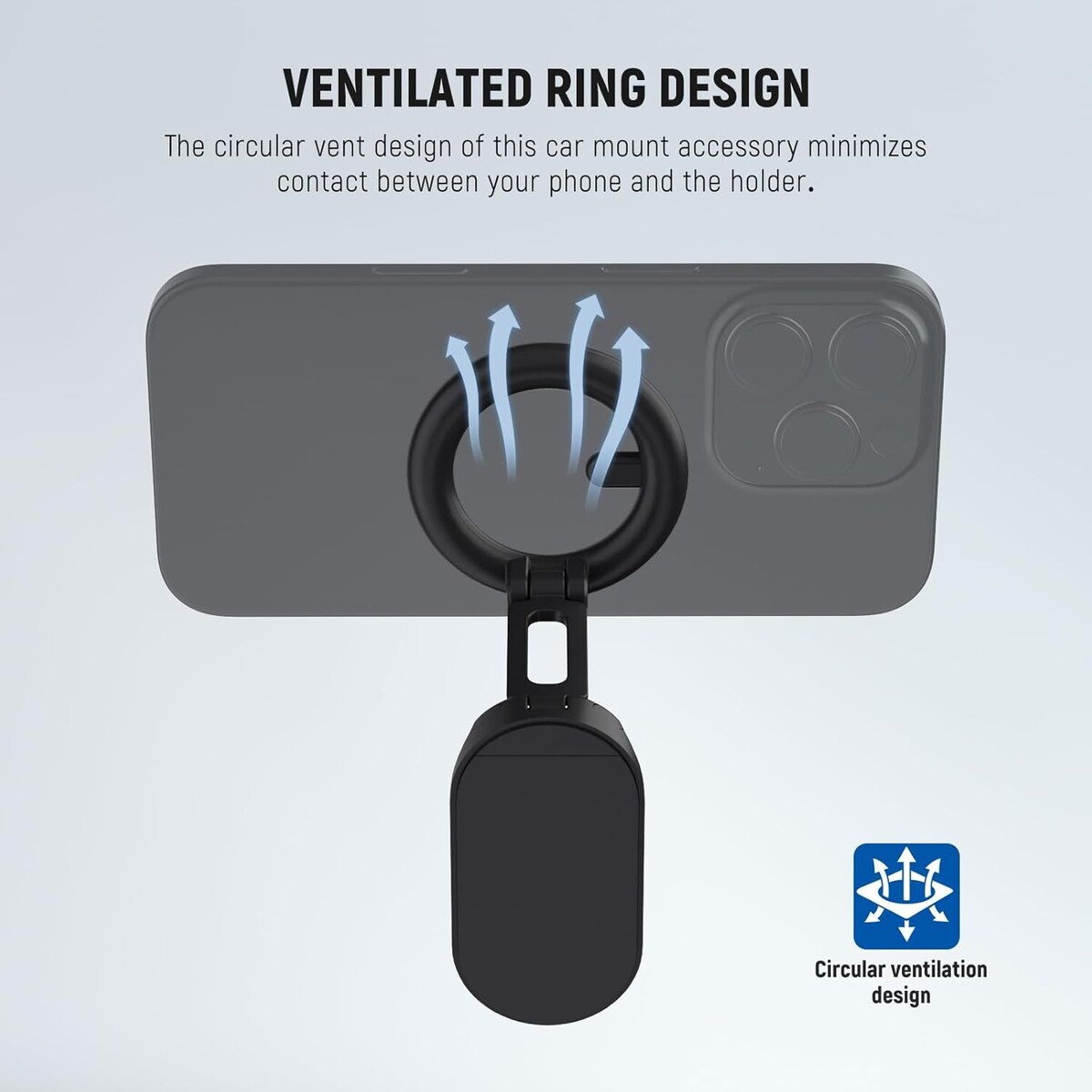 - **Havalandırmalı Halka Tasarımı:** Telefonunuz ve tutucu arasındaki teması en aza indiren dairesel havalandırma tasarımı, hava akışını artırarak özellikle uzun yolculuklarda GPS çalıştırırken telefonun aşırı ısınmasını önler.
