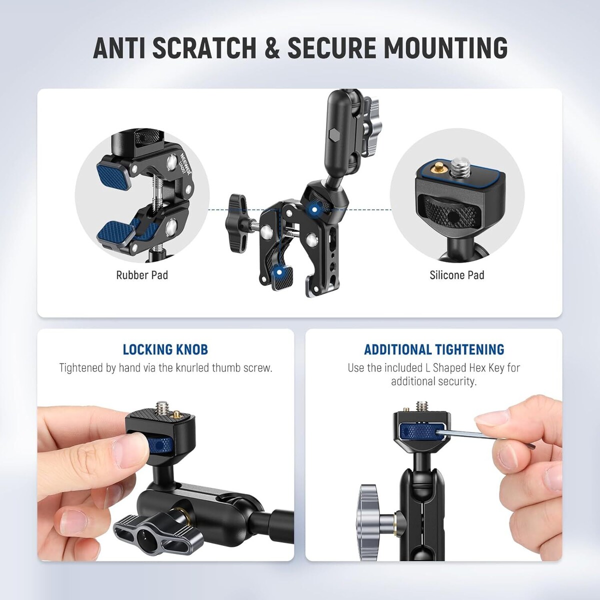- Süper Kelepçeli Mafsallı Kol: Dayanıklı alüminyum alaşımdan üretilen sihirli kol, 500 g (17.6 oz) ağırlığa kadar cihazları destekler ve statik durumlarda kullanılması önerilir. Kelepçe, 50 mm (2') kalınlığa kadar düz yüzeylere ve 40 mm (1.6') çapa kadar silindirik çubuklara (tripodlar, selfie çubukları, gimbal çubukları vb.) güvenle tutunabilir.