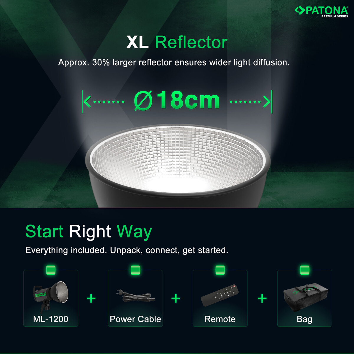 Patona ML-1200, yüksek performanslı fotoğraf ve video çekimleri için ideal bir LED ışık çözümüdür. 120 watt gücü ve 9800 lümenlik ışık akısı ile profesyonel uygulamalarda güçlü ve homojen aydınlatma sağlar.