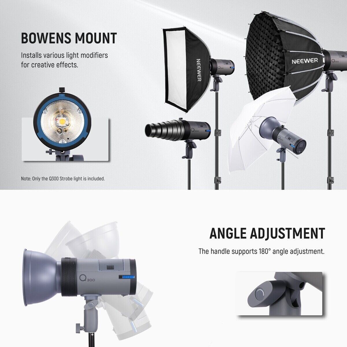 Q300, profesyonel stüdyo ve dış mekân çekimleri için tasarlanmış 300 Ws akülü flaş ünitesidir. Li-Ion batarya desteğiyle kablosuz çalışabilen Q300; 32–84 cm geniş zoom aralığı, hızlı geri dönüş ve yüksek hız senkronizasyonu özellikleriyle her koşulda esnek ve güçlü aydınlatma sağlar. Dayanıklı gövdesi ve IP54 seviyesinde toza/suya dayanıklı tasarımı sayesinde zorlu koşullarda bile güvenle kullanılabilir.