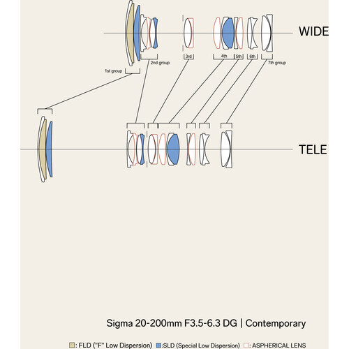 Lens, dört asferik eleman, üç Özel Düşük Dağılım (SLD) elemanı ve bir FLD (F Low Dispersion) elemanı içerir. 18 eleman 14 grup optik tasarım ve 9 bıçaklı yuvarlatılmış diyafram, zoom ve diyafram aralığı boyunca yüksek optik hassasiyet sağlar. Arka ışık direnci optimize edilerek lens parlaması ve ghosting minimuma indirilmiştir.