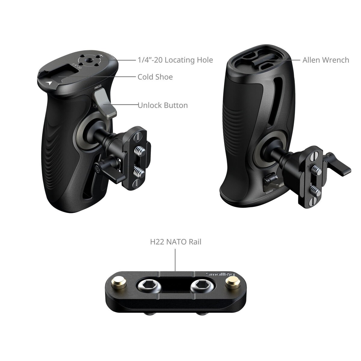 SmallRig 5160 NATO Kelepçeli Döner Yan Tutamak, elde rahat çekim için tasarlanmıştır. NATO kelepçesi kullanılarak NATO raylı kafeslere güvenli bir şekilde takılır ve kilitleme düğmesiyle sabitlenir.