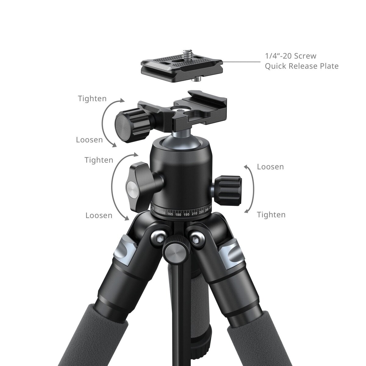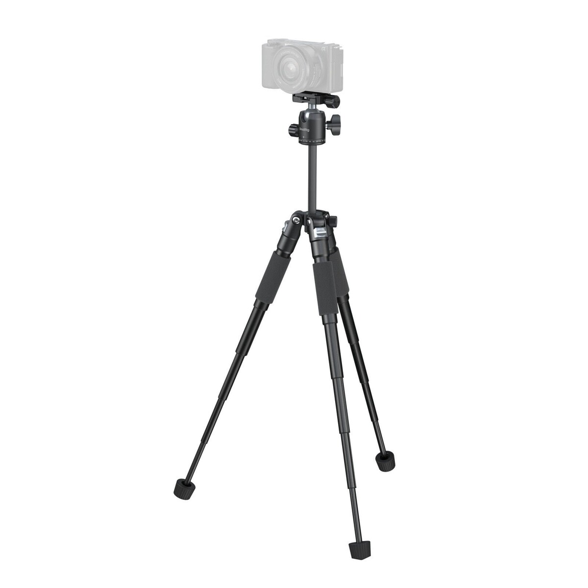Dikey olarak ayarlanabilir orta sütunu sayesinde, tripod 53,8 cm / 21,2 inç çalışma yüksekliğine kadar uzanarak çeşitli çekim açılarına olanak tanır. Katlandığında 23 cm / 9,06 inç ölçülerindedir ve 620 g / 1,37 lb ağırlığındadır, bu da onu kolay taşıma için kompakt ve hafif hale getirir. Dayanıklı alüminyum alaşımlı ayaklar 5 kg / 11 lb (başlık için 3 kg / 6,6 lb) yük taşıma kapasitesine sahiptir.