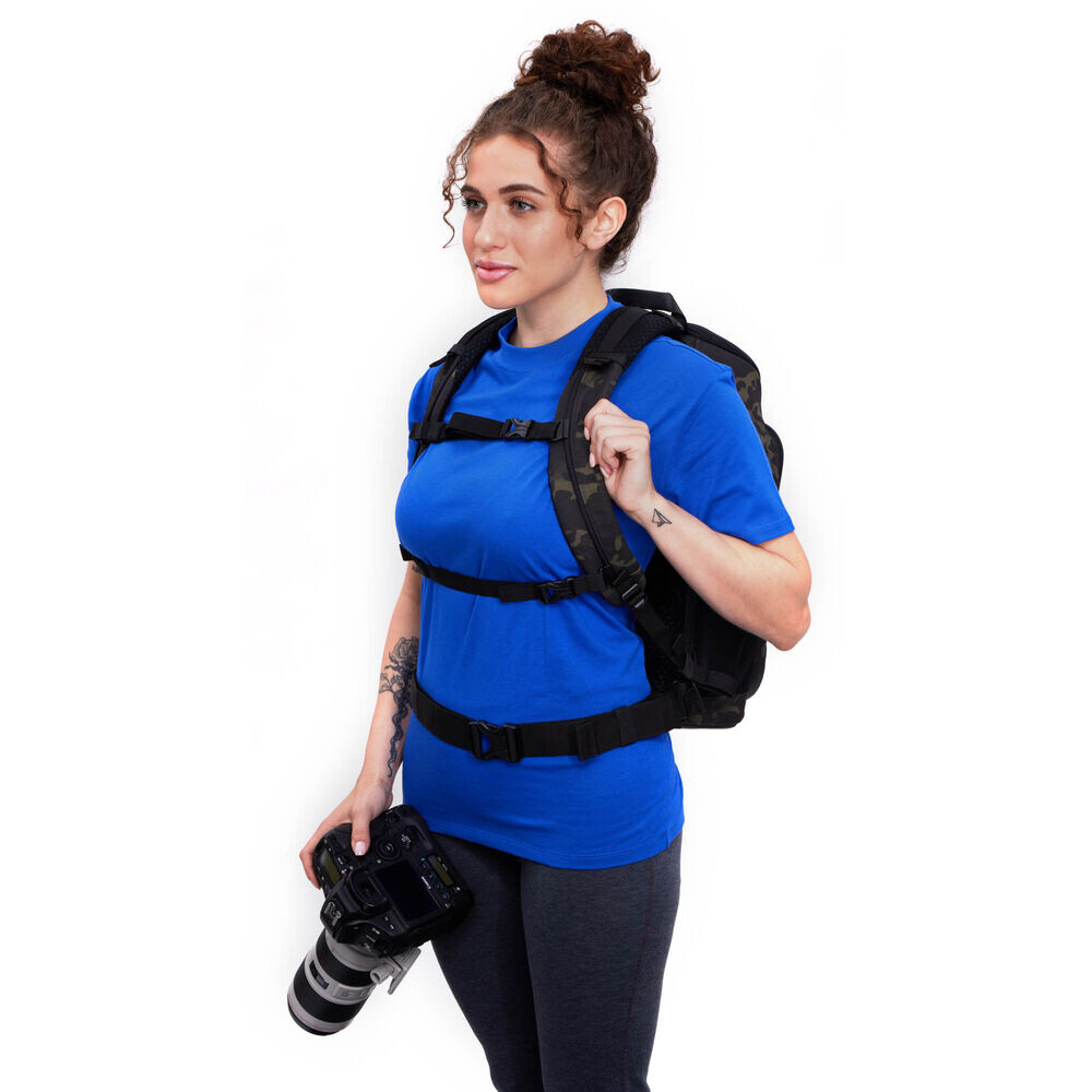 MOLLE dokuma, çantanın dış kısmına lens kapsülleri, pil ve aksesuar çantaları ve kart çantaları gibi ek Tenba aksesuarları eklemenize olanak tanır. Tenba'nın özel Airflow askı takımı ve otomatik ayarlanan Pivot-Fit kayışları, vücut şekliniz veya boyunuz ne olursa olsun, çantanın kolay taşınmasını sağlar. Çanta, göğüste yük dengelemesi sağlamak için benzersiz çift göğüs kayışlarına sahiptir ve kadın kullanıcıların kayışları üstün konfor için göğüslerin üstünde veya altında konumlandırmasına izin verir. İstenirse göğüs kayışlarından biri çıkarılabilir.