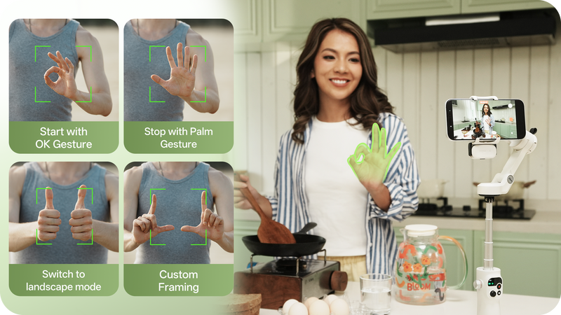 Akıllı telefon kameranı sadece bilek hareketlerinle sağa–sola ya da yukarı–aşağı yönlendirebilirsin. Bu sezgisel kontrol sistemi, gimbali uzaktan yönetmene olanak tanır ve tek başına yapması zor olan sinematik, akıcı kamera hareketlerini kolayca oluşturmanı sağlar.