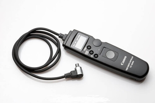 Canon TC-80N3 Zamanlayıcılı Uzaktan Kumanda, 2.6 '(80cm) kablolu ve otomatik zamanlayıcı, aralık zamanlayıcı, uzun pozlama zamanlayıcısı ve poz sayımı ayar özelliği olan bir uzaktan kumanda anahtarıdır. Zamanlayıcı 1 saniye ile 99 saat, 59 dakika veya 59 saniye arasında herhangi bir yere ayarlanabilir. Bir kadran, sayısal ayarları tek bir parmakla kolayca girmenizi sağlar. LCD panel de aydınlatılabilir. Denetleyicinin arkasında EOS-3'ün uzaktan kumanda soketi kapağını tutmak için bir delik vardır.